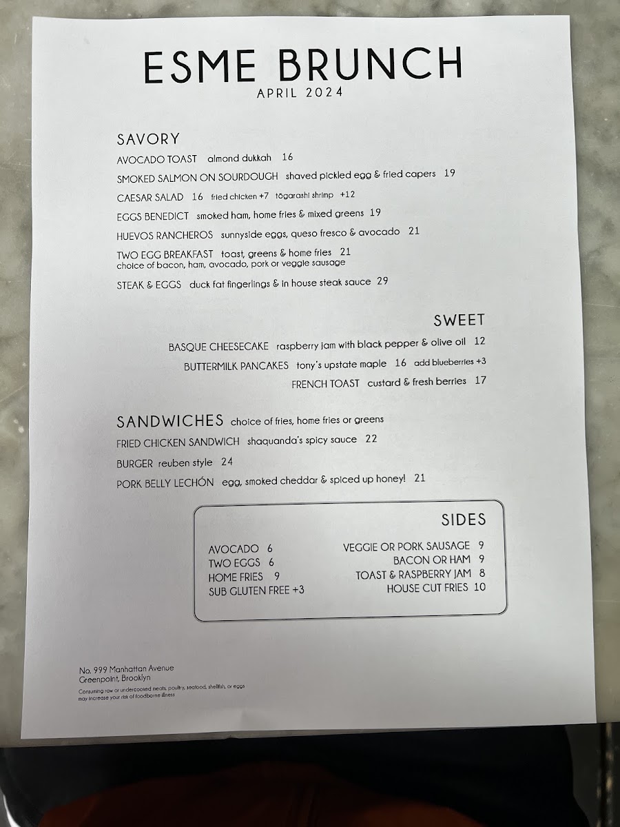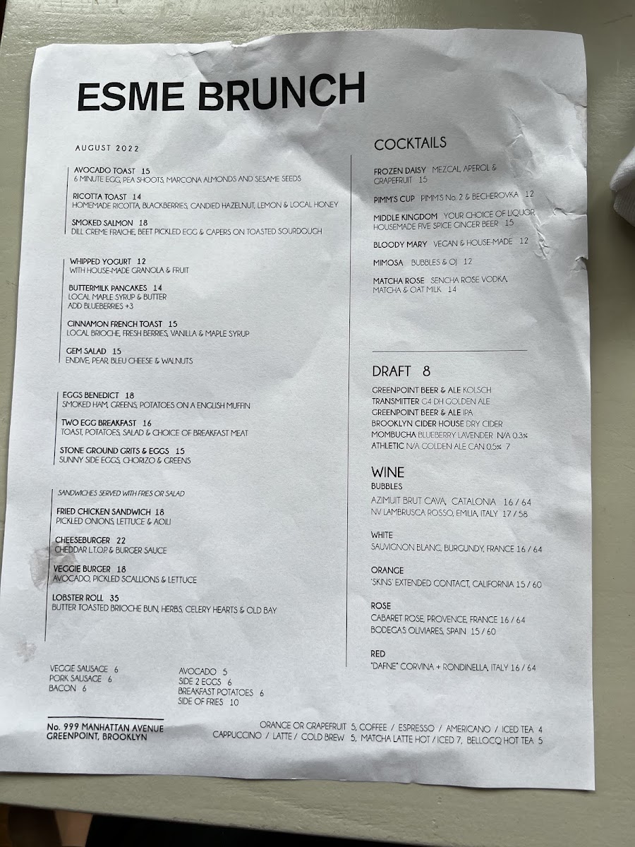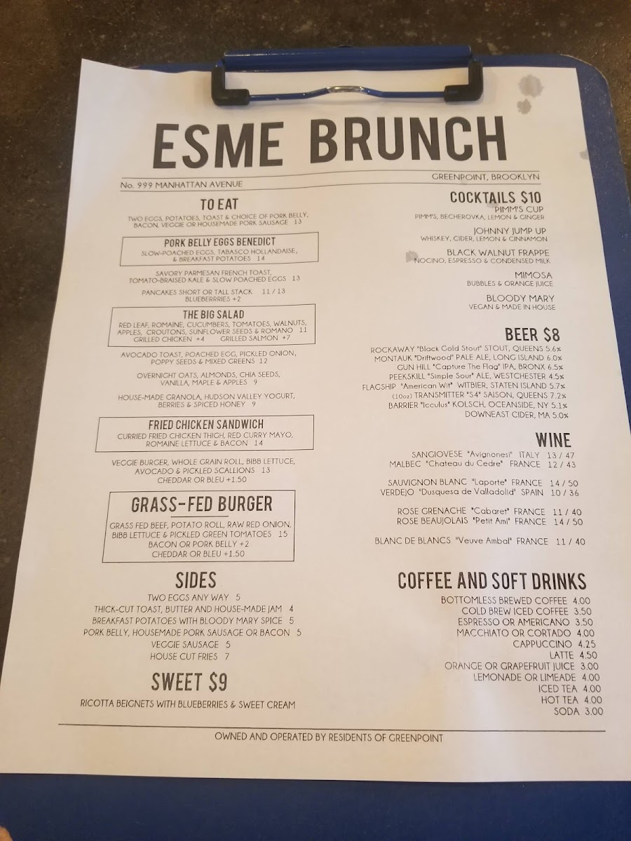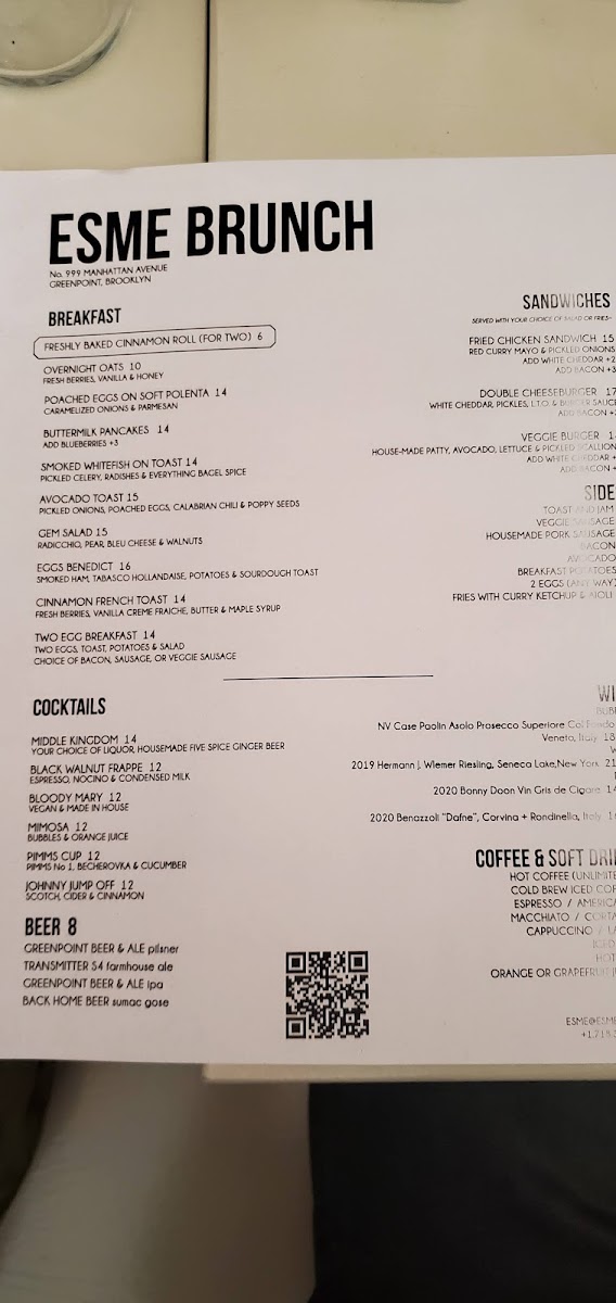 Welcome to Esme Brooklyn, the charming eatery nestled in Greenpoint, where culinary creativity meets comfort. With a focus on fresh ingredients and thoughtful preparation, Esme's menu seamlessly merges hearty brunch fare and artisanal cocktails. Whether indulging in the Buttermilk Pancakes or the innovative Smoked Salmon Toast, each dish is a delightful showcase of flavors. The Avocado Toast topped with a 6-minute egg adds a contemporary twist, while the Ricotta Toast with blackberries offers a sweet, decadent treat.