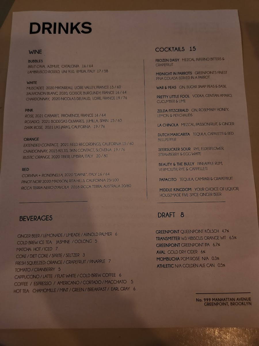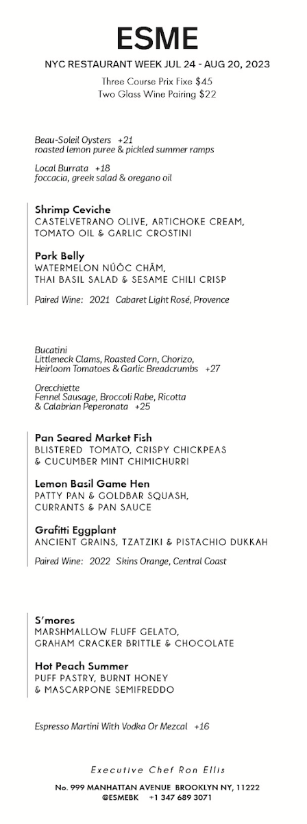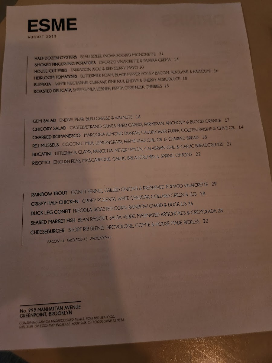 The cocktail selection is equally impressive. Signature drinks like the Middle Kingdom and Papacito reflect a dedication to craft mixology, complementing the diverse menu perfectly. The atmosphere is relaxed yet vibrant, with cozy indoor seating and a picturesque outdoor patio. With its excellent service and competitive pricing, Esme Brooklyn invites food lovers to experience a memorable meal in a welcoming neighborhood setting.